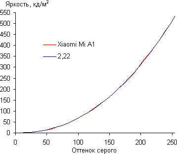 Контрастность (примерно в центре экрана) высокая— порядка 1300:1. Время отклика при переходе черный-белый-черный равно 27 мс (13 мс вкл. + 14 мс выкл.). Переход между полутонами серого 25% и 75% (по численному значению цвета) и обратно в сумме занимает 51 мс. Построенная по 32 точкам с равным интервалом по численному значению оттенка серого гамма-кривая не выявила завала ни в светах, ни в тенях. Показатель аппроксимирующей степенной функции равен 2,22, что близко к стандартному значению 2,2. При этом реальная гамма-кривая мало отклоняется от степенной зависимости: