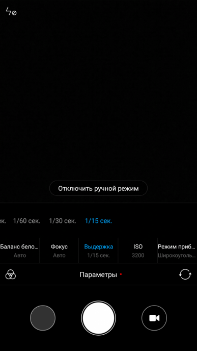 В меню есть ручные настройки для фото- и видеосъемки (выдержка (от 1/1000 до 1/15 с), светочувствительность (до ISO 3200), баланс белого, а также выбор объектива). Но даже в «Про»-режиме возможности сохранять снимки в RAW нет.