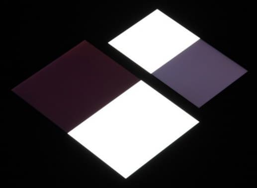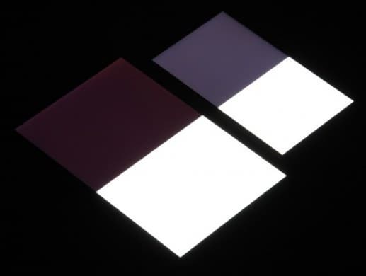 Яркость под углом у экранов уменьшилась (как минимум в 5 раз, исходя из разницы в выдержке), но у Xiaomi Mi A1 снижение яркости чуть больше. Черное поле при отклонении по диагонали высветляется сильно и приобретает красно-фиолетовый оттенок. Фотографии ниже это демонстрируют (яркость белых участков в перпендикулярном плоскости экранов направлении одинаковая!):