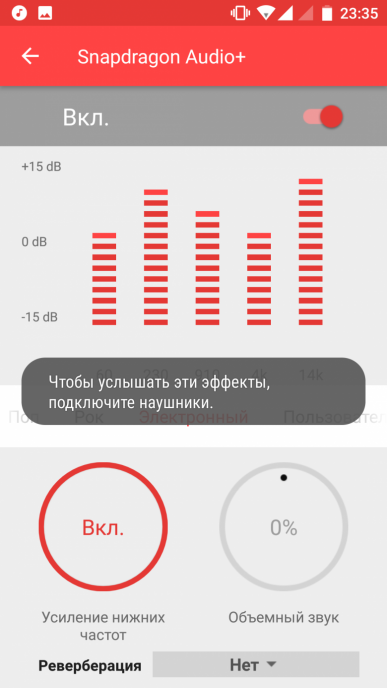 Для прослушивания музыки используется штатный плеер Google Music со знакомым интерфейсом и ручными настройками, большинство из которых доступны только при подключении наушников. И в наушниках, и во внешнем динамике звук чистый, насыщенный, яркий и достаточно громкий, благодаря выделенному аудиочипу NXP Smart PA нового поколения с поддержкой программной технологии Dirac HD Sound. Усилитель поддерживает подключение высокоомных наушников (до 600 Ом).