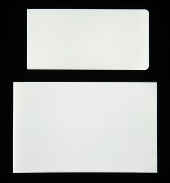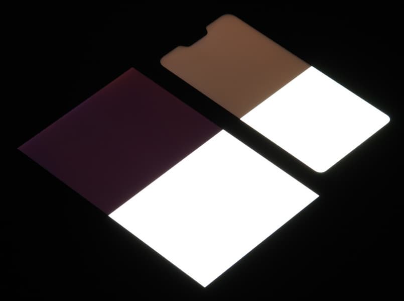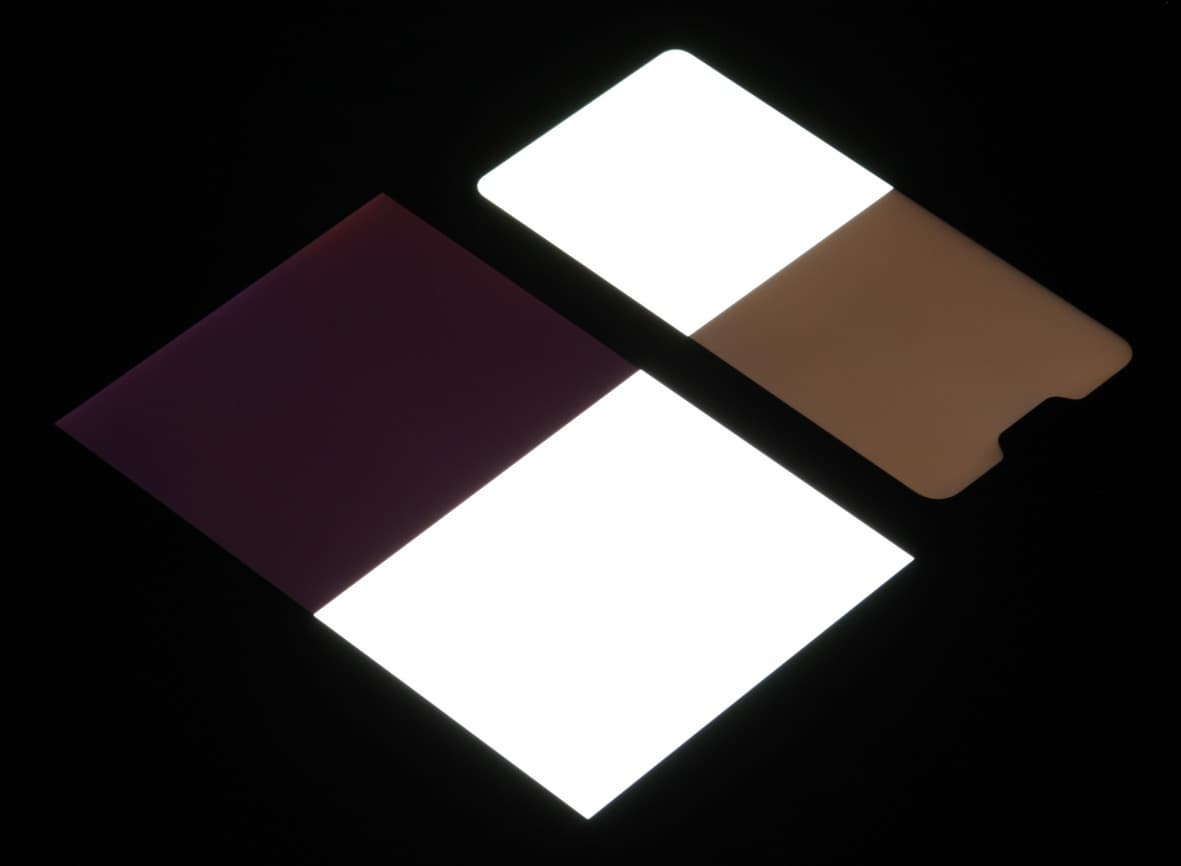 Черное поле при отклонении по диагонали сильно высветляется и приобретает красноватый оттенок. Фотографии ниже это демонстрируют (яркость белых участков в перпендикулярном плоскости экранов направлении одинаковая!):