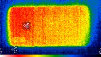 Нагрев локализован в верхней части аппарата, что, видимо, соответствует расположению микросхемы SoC. По данным теплокамеры, максимальный нагрев составил всего 33 градуса (при температуре окружающего воздуха в 24 градуса), это совсем мало.