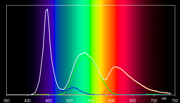 При этом горбы зеленого и красного цветов относительно хорошо разделены, что и приводит к некоторому уширению цветового охвата.