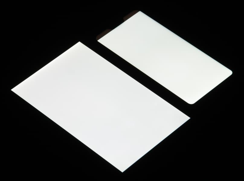 Лицевая поверхность экрана выполнена в виде стеклянной пластины с зеркально-гладкой поверхностью, устойчивой к появлению царапин. Судя по отражению объектов, антибликовые свойства экрана не хуже, чем у экрана Google Nexus 7 (2013) (далее просто Nexus 7). Для наглядности приведем фотографию, на которой в выключенных экранах отражается белая поверхность (слева — Nexus 7, справа — Xiaomi Mi A2 Lite, далее их можно различать по размеру):