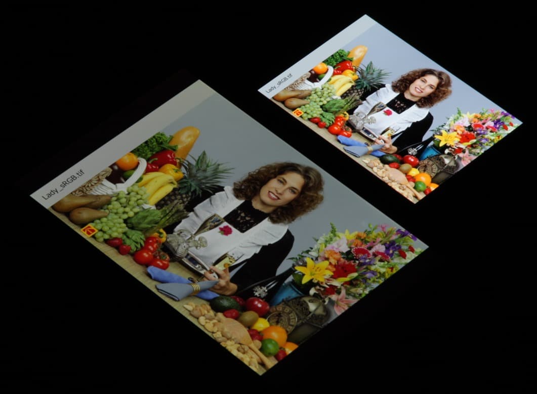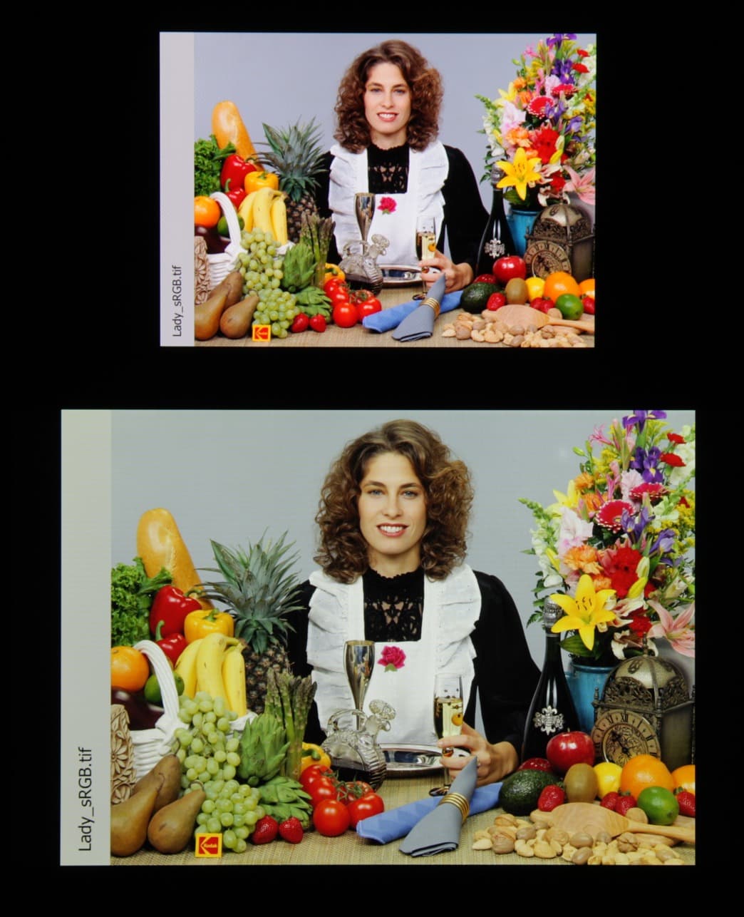 Цвета на экране Xiaomi Mi A3 перенасыщены (обратите внимание на помидоры, бананы, салфетку и оттенок лица), а цветовой баланс немного отличается. Напомним, что фотография не может служить надежным источником сведений о качестве цветопередачи и приводится только для условной наглядной иллюстрации. В частности, выраженный красноватый оттенок белого и серого полей, присутствующий на фотографиях экрана Xiaomi Mi A3, при перпендикулярном взгляде визуально отсутствует, что подтверждается аппаратными тестами с помощью спектрофотометра. Причина в том, что спектральная чувствительность матрицы фотоаппарата неточно совпадает с этой характеристикой человеческого зрения.