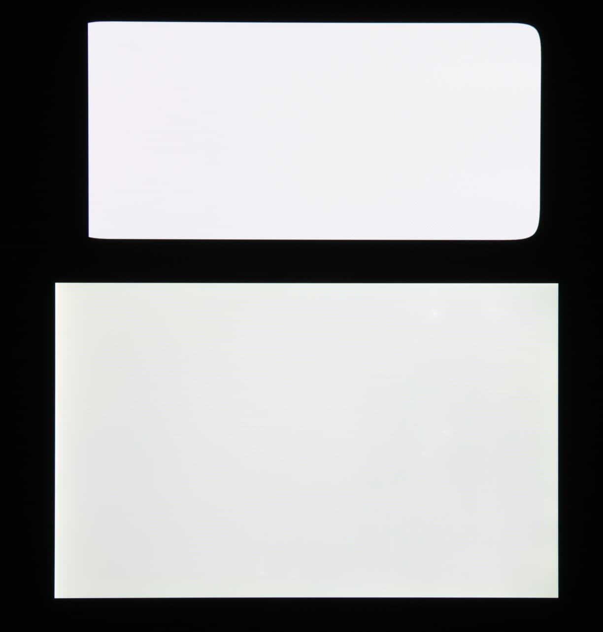 Экран характеризуется великолепными углами обзора. Правда, белый цвет при отклонении даже на небольшие углы поочередно приобретает едва видимый сине-зеленый и розоватый оттенок, но черный цвет остается просто черным под любыми углами. Он настолько черный, что параметр контрастности в данном случае неприменим. Для сравнения приведем фотографии, на которых на экраны Xiaomi Mi A3 и Nexus 7 выведены одинаковые изображения, при этом яркость экранов изначально установлена примерно на 200 кд/м², а цветовой баланс на фотоаппарате принудительно переключен на 6500 К.