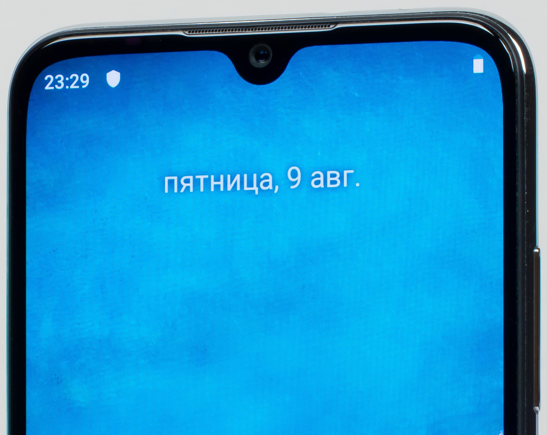 На передней панели присутствует каплевидный вырез в экране, в котором расположена фронтальная камера, а также имеется светодиодный индикатор событий.