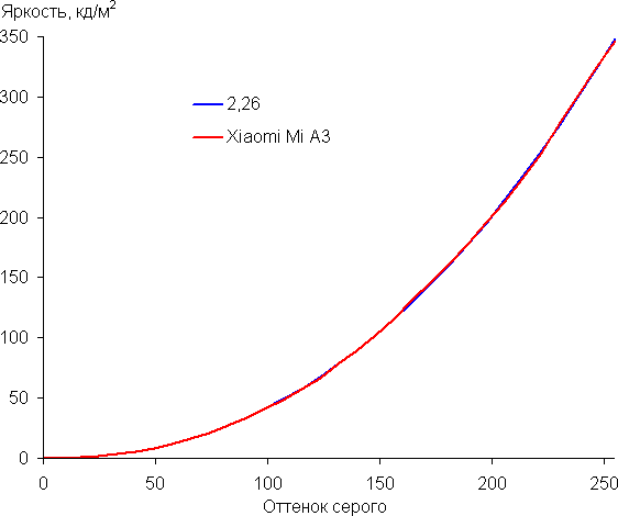 Построенная по 32 точкам с равным интервалом по численному значению оттенка серого гамма-кривая показала, что существенного завала нет ни в светах, ни в тенях. Показатель аппроксимирующей степенной функции равен 2,26, что немного выше стандартного значения 2,2. При этом реальная гамма-кривая немного отклоняется от степенной зависимости: