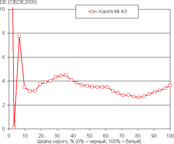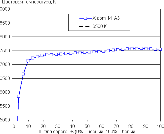 Баланс оттенков на шкале серого хороший, поскольку цветовая температура несильно выше стандартных 6500 К, а отклонение от спектра абсолютно черного тела (ΔE) ниже 10, что для потребительского устройства считается неплохим показателем. При этом цветовая температура и ΔE мало изменяются от оттенка к оттенку — это положительно сказывается на визуальной оценке цветового баланса. (Самые темные области шкалы серого можно не учитывать, так как там баланс цветов не имеет большого значения, да и погрешность измерений цветовых характеристик на низкой яркости большая.)