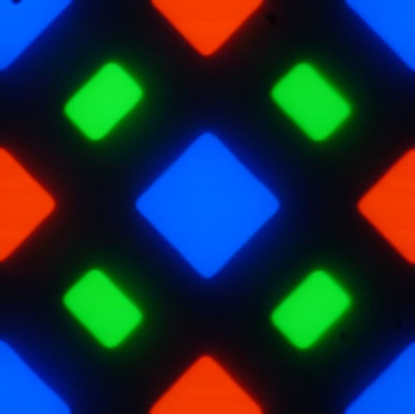 В этом экране используется матрица Super AMOLED — активная матрица на органических светодиодах. Полноцветное изображение создается с помощью субпикселей трех цветов — красного (R), зеленого (G) и синего (B), но красных и синих субпикселей в два раза меньше, что можно обозначить как RGBG. Это подтверждается фрагментом микрофотографии: