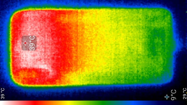 Нагрев больше в верхней части аппарата, что, видимо, соответствует расположению микросхемы SoC. По данным теплокамеры, максимальный нагрев составил 39 градусов (при температуре окружающего воздуха в 24 градуса), это не очень много.