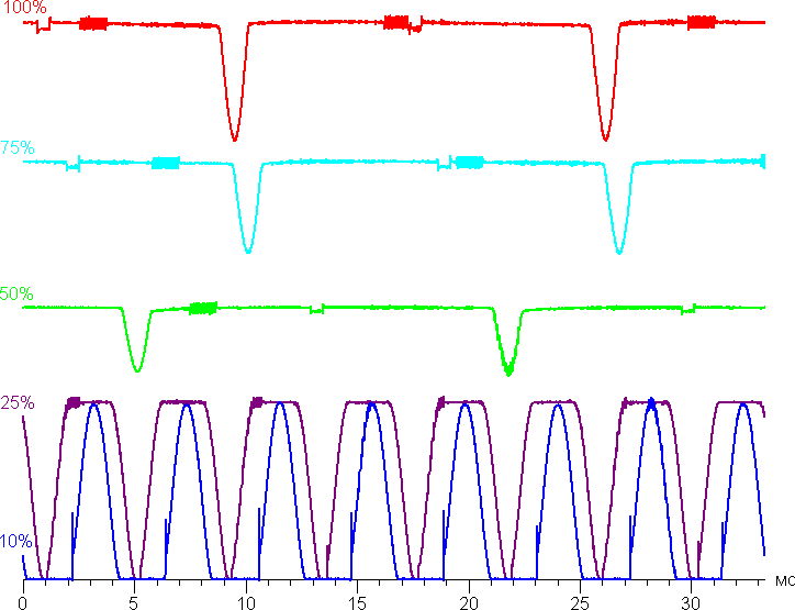 На любом уровне яркости присутствует значимая модуляция с частотой 60 или 240 Гц. На рисунке ниже приведены зависимости яркости (вертикальная ось) от времени (горизонтальная ось) для нескольких значений настройки яркости: