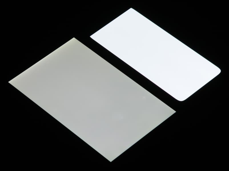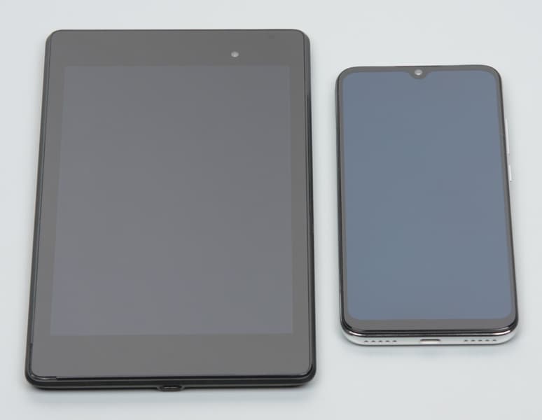 Лицевая поверхность экрана выполнена в виде стеклянной пластины с зеркально-гладкой поверхностью, устойчивой к появлению царапин. Судя по отражению объектов, антибликовые свойства экрана не хуже, чем у экрана Google Nexus 7 (2013) (далее просто Nexus 7). Для наглядности приведем фотографию, на которой в выключенных экранах отражается белая поверхность (слева — Nexus 7, справа — Xiaomi Mi A3, далее их можно различать по размеру):