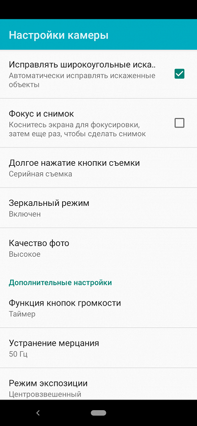 Тыльная группа камер состоит из трех модулей. У первого — 48-мегапиксельный сенсор (размер матрицы — 1/2″, размер пикселя — 0,8 мкм) и объектив с диафрагмой f/1,8. Есть фазовый PDAF-автофокус, но нет оптической стабилизации — только электронная. Рядом расположен широкоугольный (118°) модуль с сенсором 8 Мп и объективом с диафрагмой f/2,2 (размер пикселя — 1,12 мкм). Оптические искажения широкоугольной оптики в настройках программно правятся с помощью функции «Автоматически исправлять искаженные объекты».