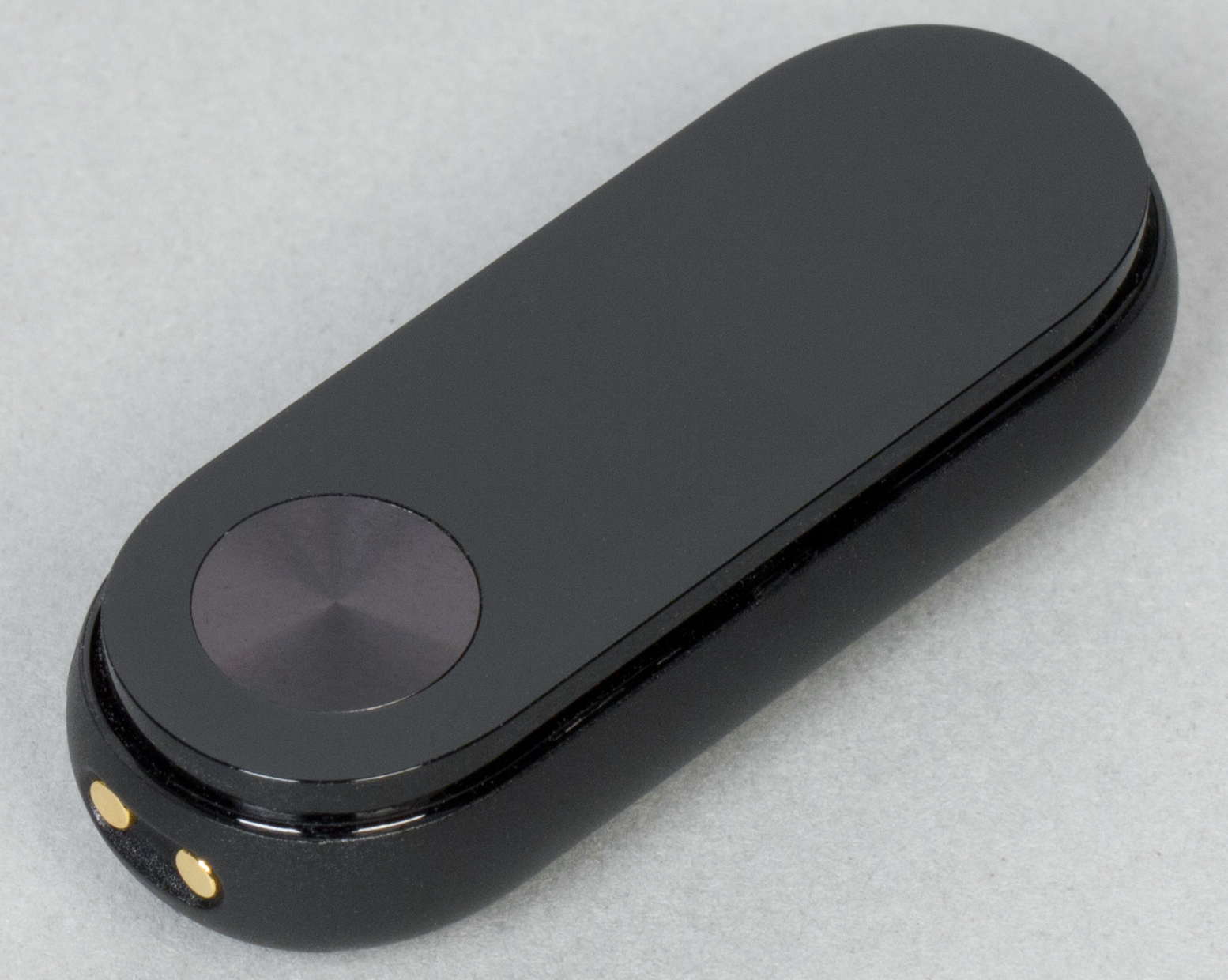 Сбоку на устройстве видны два контакта — с их помощью Mi Band 2 заряжается. Для подзарядки его надо вставить в колыбельку на комплектном кабеле этими контактами вперед.