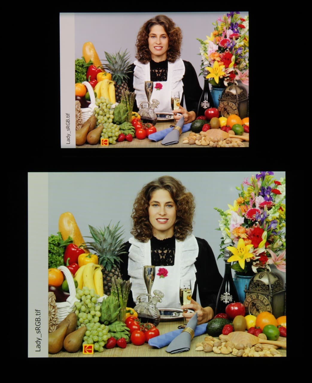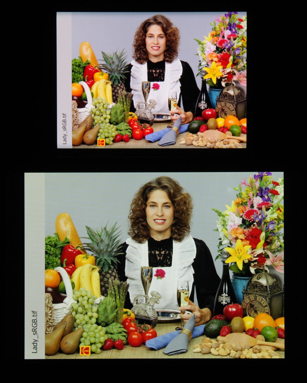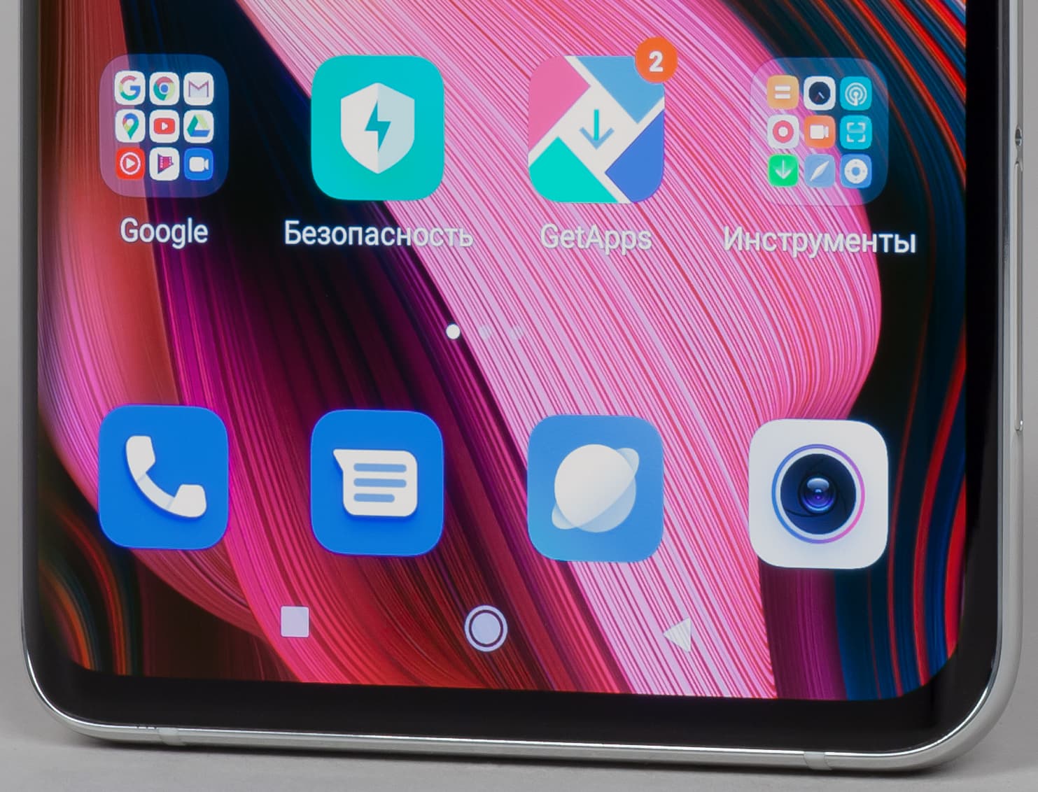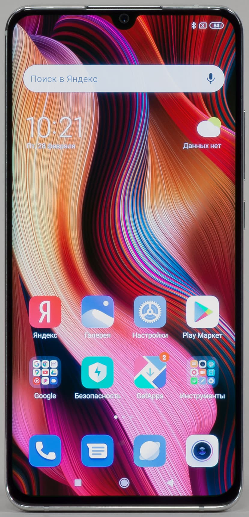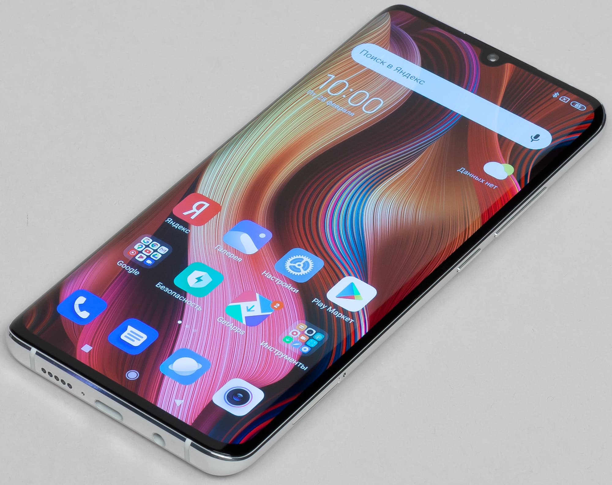 Цвета на экране Xiaomi Mi Note 10 Pro перенасыщены (обратите внимание на помидоры, бананы, салфетку и оттенок лица), а цветовой баланс немного отличается. Напомним, что фотография не может служить надежным источником сведений о качестве цветопередачи и приводится только для условной наглядной иллюстрации. В частности, выраженный красноватый оттенок белого и серого полей, присутствующий на фотографиях экрана Xiaomi Mi Note 10 Pro, при перпендикулярном взгляде визуально отсутствует, что подтверждается аппаратными тестами с помощью спектрофотометра. Причина в том, что спектральная чувствительность матрицы фотоаппарата неточно совпадает с этой характеристикой человеческого зрения. Заметим, что в данном случае картинка занимает в высоту (при ландшафтной ориентации экрана) всю доступную для вывода изображения область и заходит на загнутые края экрана, что приводит к легкому затемнению и искажению цвета. Также на свету эти области почти всегда бликуют, что еще больше мешает при просмотре изображений, выведенных на весь экран. И даже картинка фильмов с соотношением сторон 16:9 заходит на загибы, что мешает при просмотре кино.