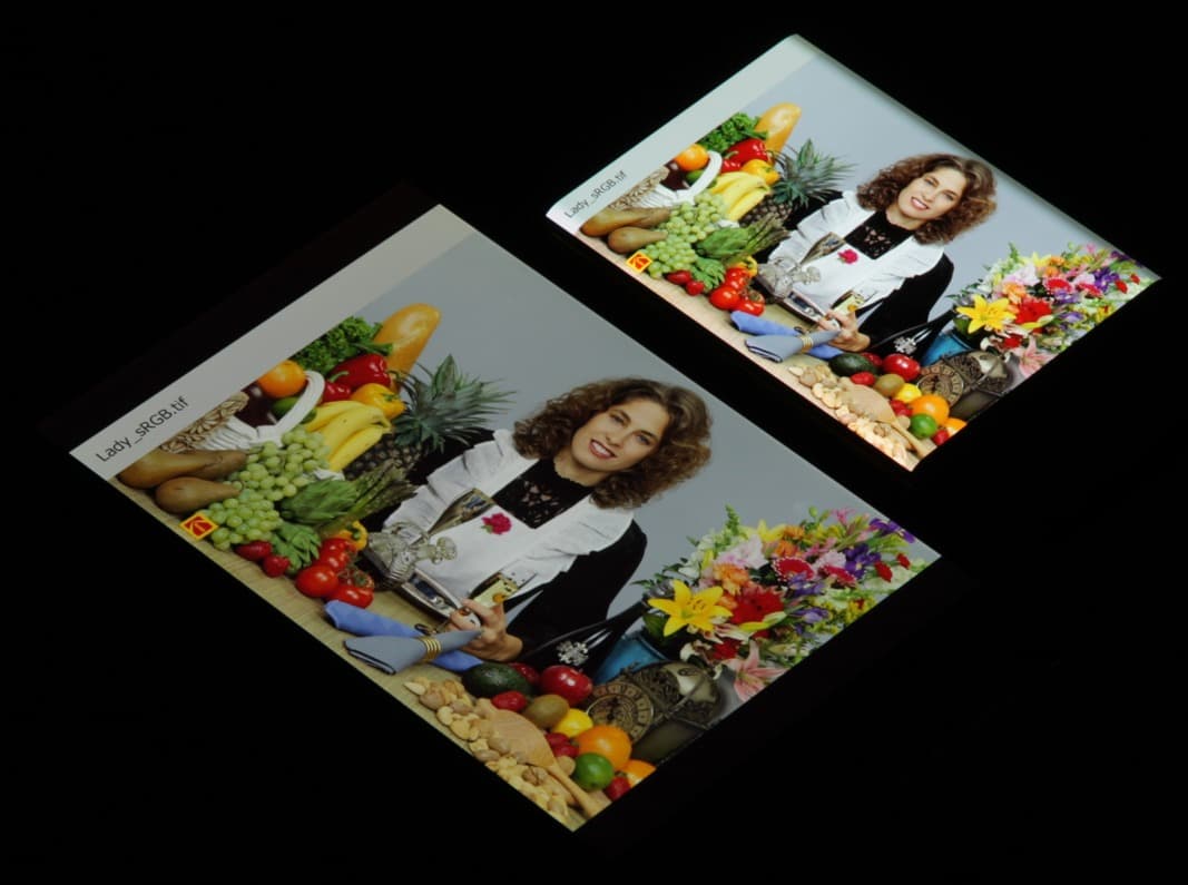 Экран характеризуется великолепными углами обзора. Правда, белый цвет при отклонении даже на небольшие углы поочередно приобретает едва видимый сине-зеленый и розоватый оттенок, но черный цвет остается просто черным под любыми углами. Он настолько черный, что параметр контрастности в данном случае неприменим. Для сравнения приведем фотографии, на которых на экраны Xiaomi Mi Note 10 Pro и Nexus 7 выведены одинаковые изображения, при этом яркость экранов изначально установлена примерно на 200 кд/м², а цветовой баланс на фотоаппарате принудительно переключен на 6500 К.