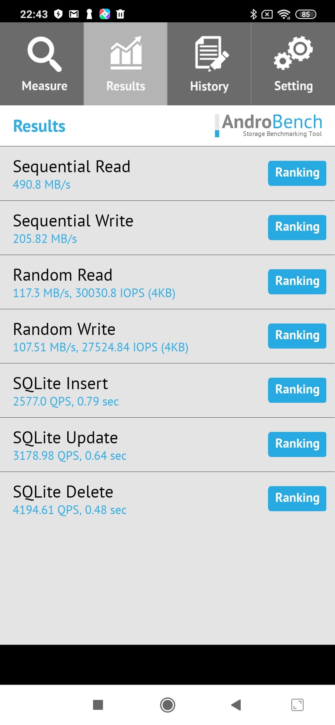 Результаты теста AndroBench на скорость работы с памятью: