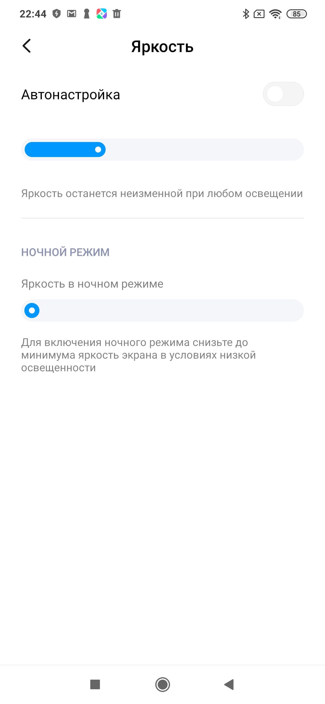 Есть и еще один вариант управления яркостью: привязка выбора минимальной яркости к установке яркости на минимум (в ручном или в автоматическом режиме). По факту можно просто изменить минимальный уровень яркости в ручном режиме с 2 до 3 кд/м².