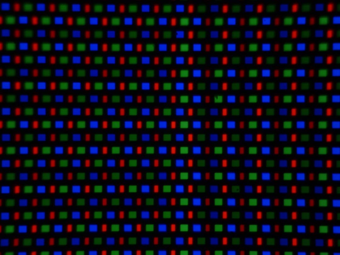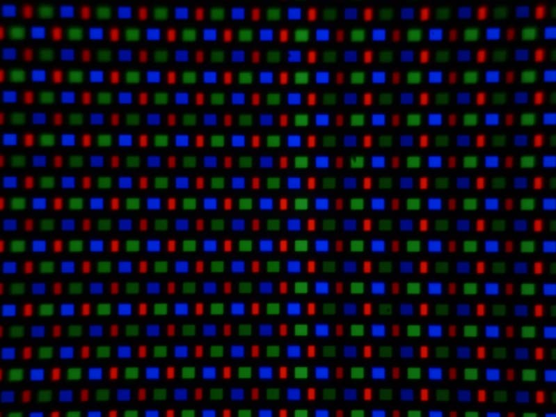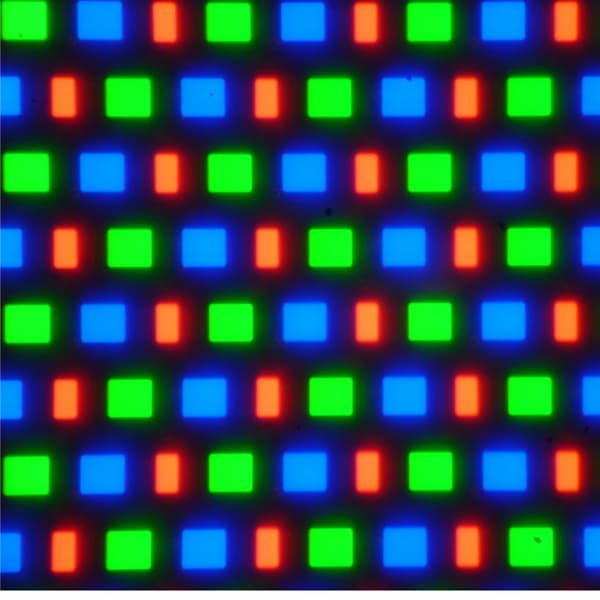 В этом экране используется матрица AMOLED — активная матрица на органических светодиодах. Полноцветное изображение создается с помощью субпикселей трех цветов — красного, зеленого и синего в равном количестве. Это подтверждается фрагментом микрофотографии: