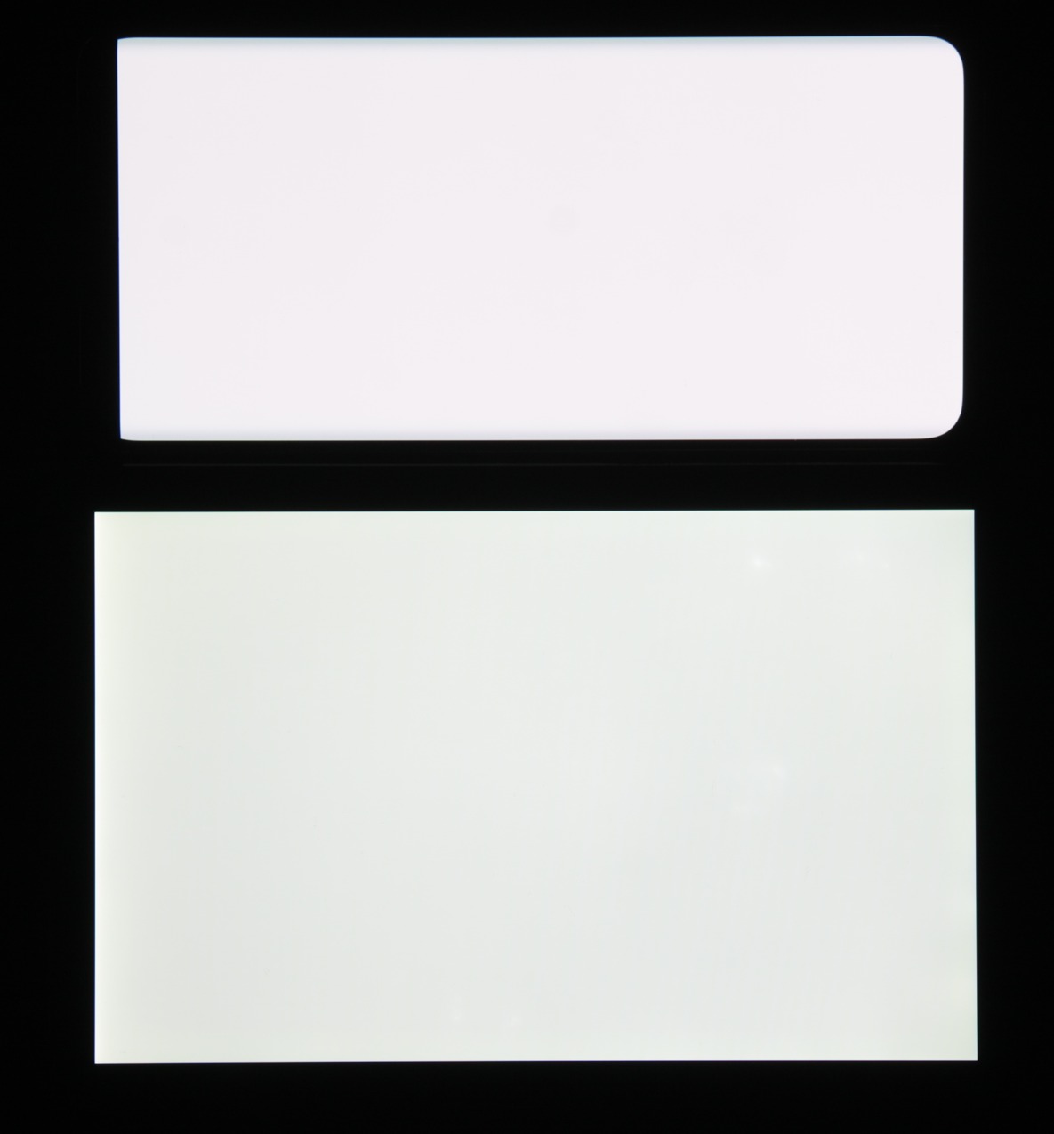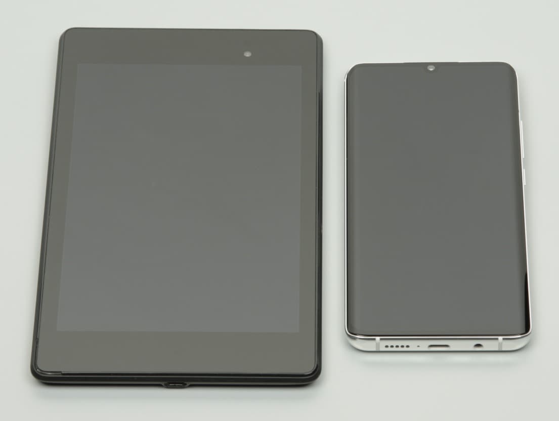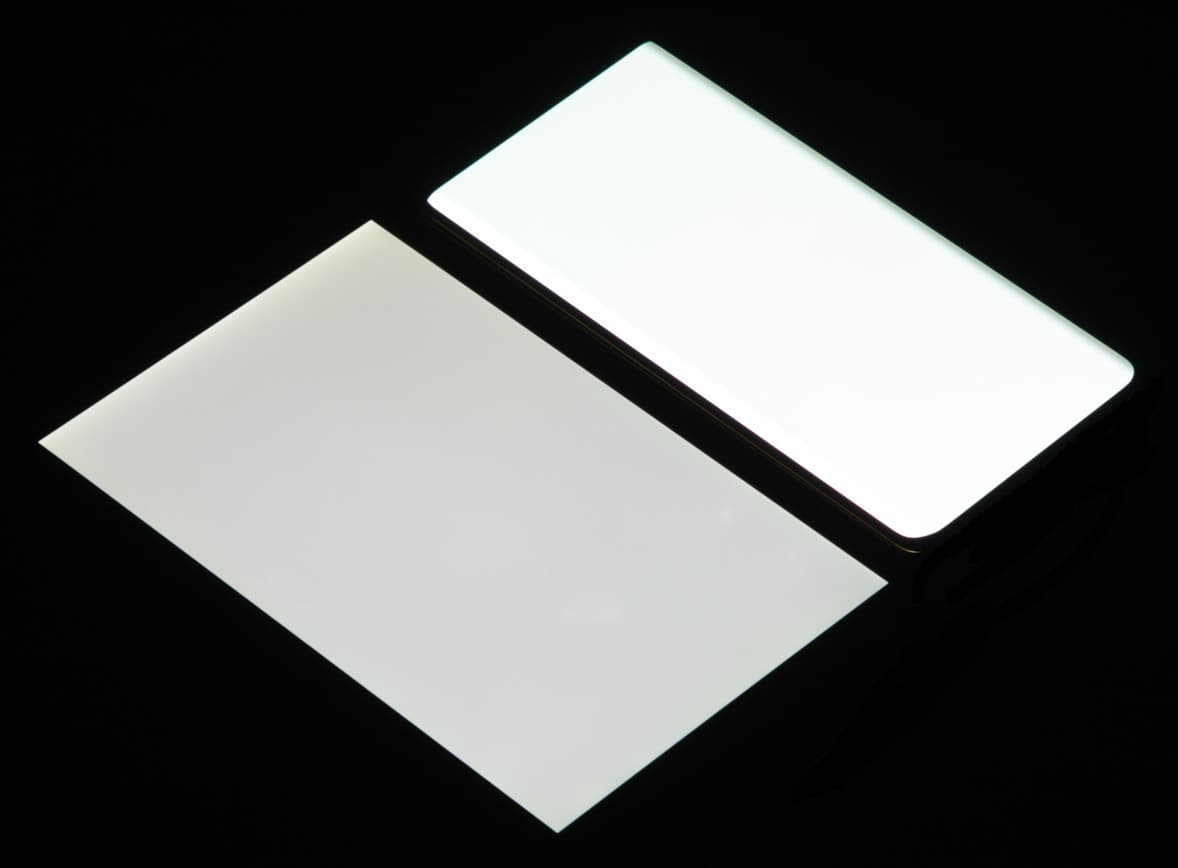 Лицевая поверхность экрана выполнена в виде стеклянной пластины с зеркально-гладкой поверхностью, устойчивой к появлению царапин. Судя по отражению объектов, антибликовые свойства экрана лучше, чем у экрана Google Nexus 7 (2013) (далее просто Nexus 7). Для наглядности приведем фотографию, на которой в выключенных экранах отражается белая поверхность (слева — Nexus 7, справа — Xiaomi Mi Note 10 Pro, далее их можно различать по размеру):