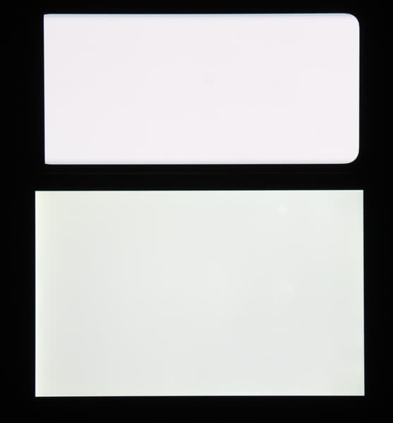 Равномерность яркости и цветового тона белого поля хорошая (за исключением едва видимого затемнения и изменения оттенка к загнутым краям).