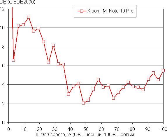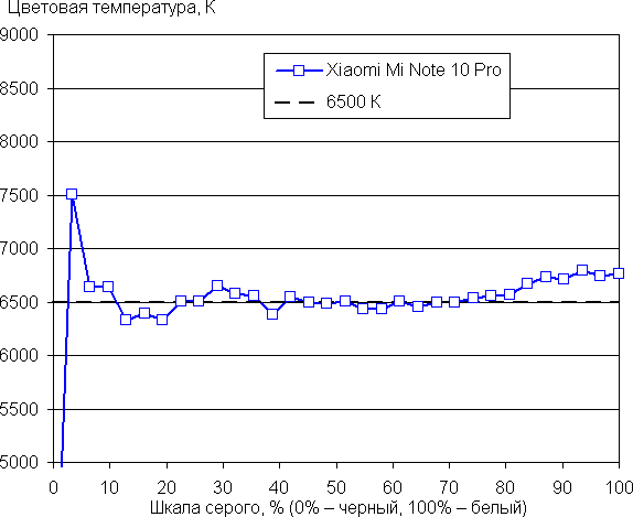 Напомним, что в случае OLED-экранов яркость фрагментов изображения динамично меняется в соответствии с характером выводимого изображения — уменьшается для светлых в целом изображений. В итоге полученная зависимость яркости от оттенка (гамма-кривая), скорее всего, немного не соответствует гамма-кривой статичного изображения, так как измерения проводились при последовательном выводе оттенков серого почти на весь экран.