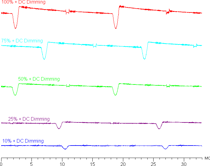 На любом уровне яркости присутствует значимая модуляция с частотой примерно 60 или 240 Гц. На рисунке ниже приведены зависимости яркости (вертикальная ось) от времени (горизонтальная ось) для нескольких значений настройки яркости: