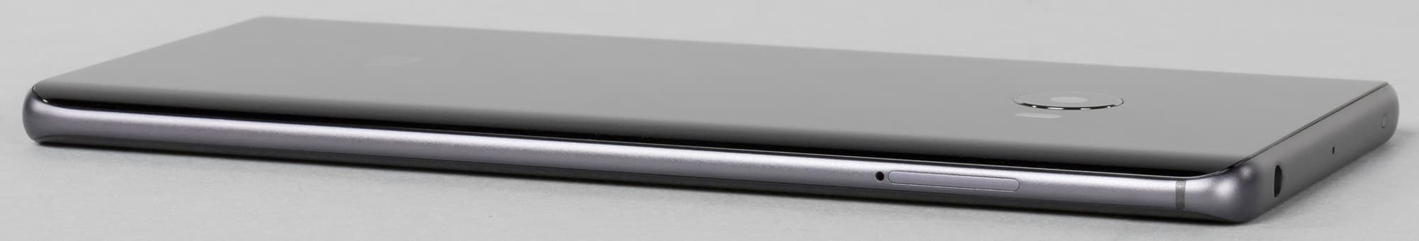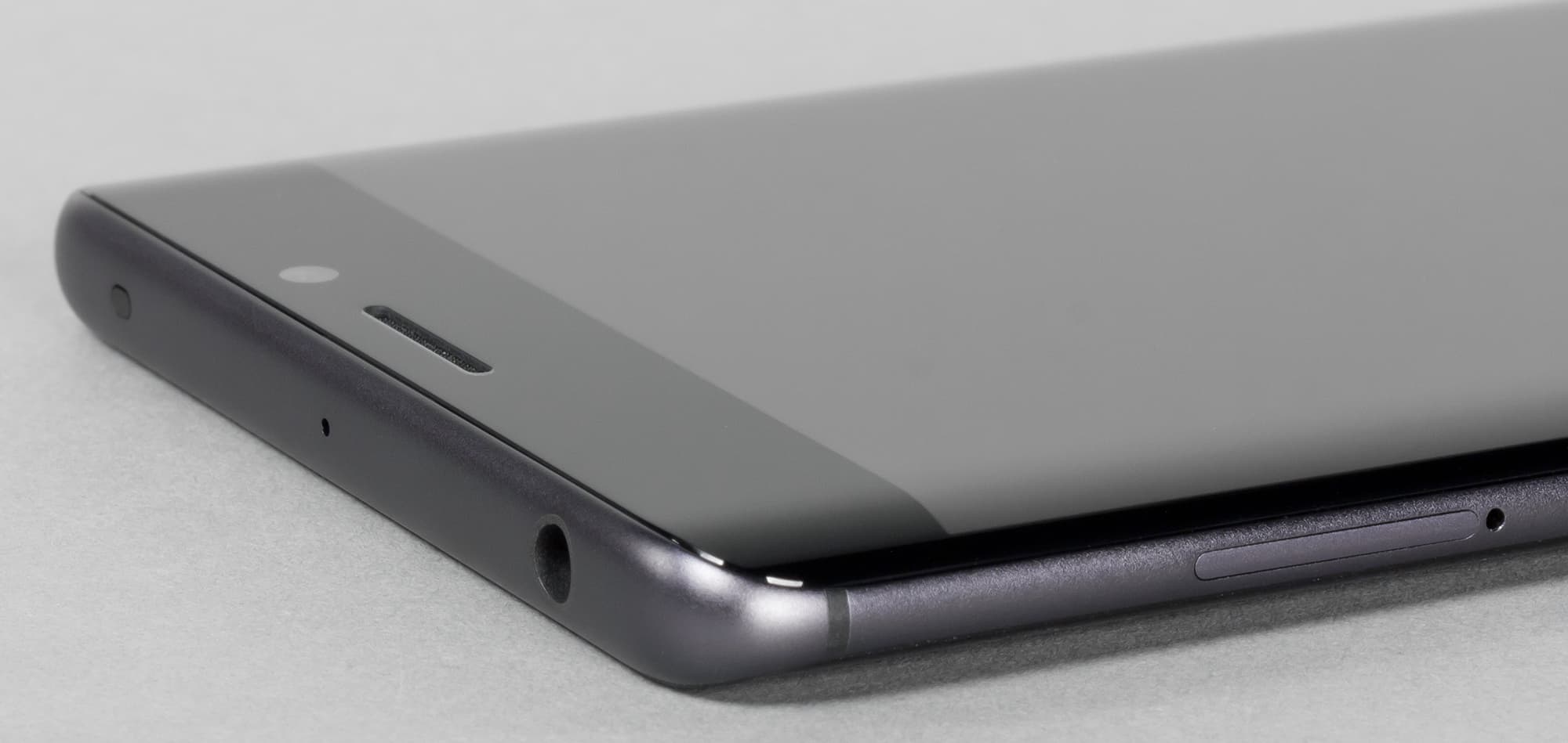 Если использование такой формы на задней панели можно было бы записать в плюсы с точки зрения удобства поднятия смартфона со стола, то преимущества этой конструкции для лицевой панели, на наш взгляд, как минимум спорно. Причин тому несколько. Первая заключается в том, что в результате такого решения непосредственно металлические части боковых ребер становятся тонкими и менее отдаленными от стола — поднять устройство становится сложнее.