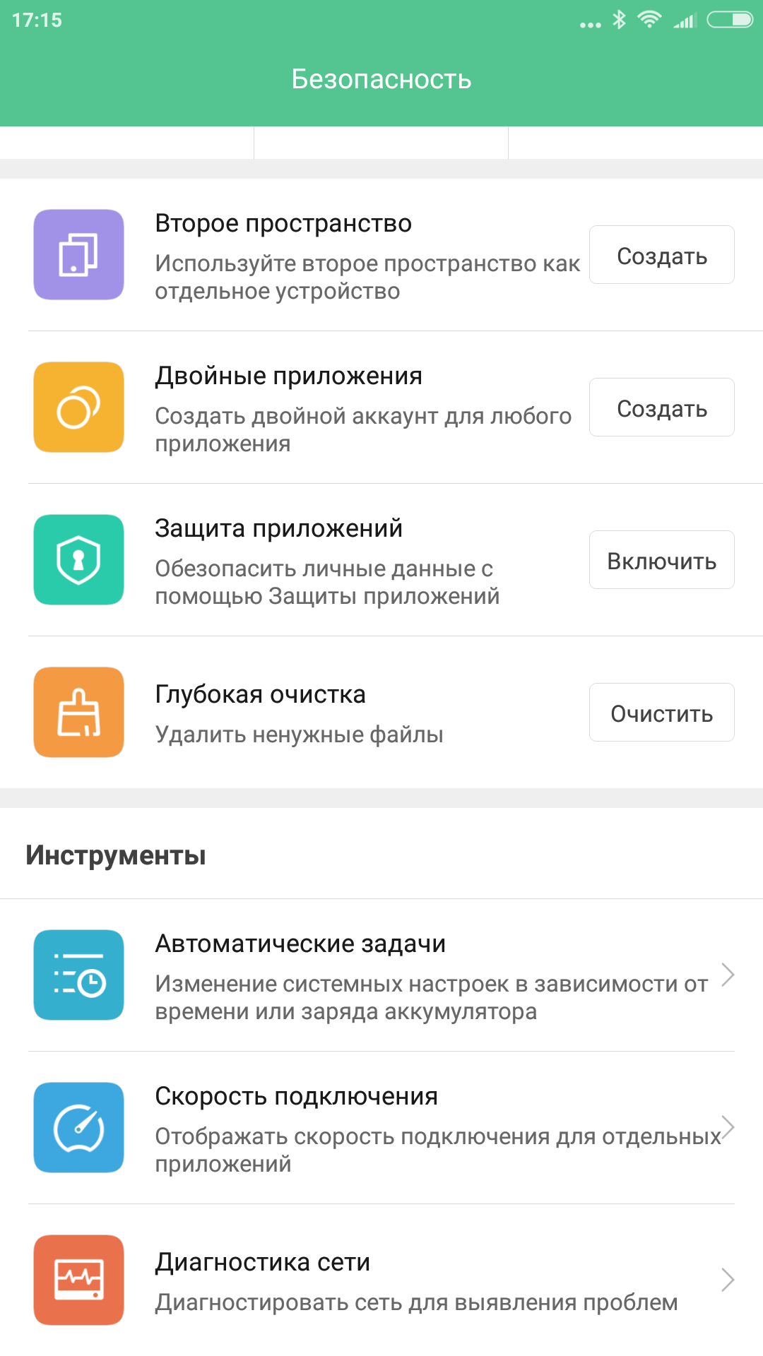 В группе «Инструменты» есть интересная функция создания задач автоматизации — сочетания условия и действия. Причем в качестве условий могут выступать как время, так и уровень заряда батареи. А в списке действий представлены основные переключатели режимов — синхронизация, Wi-Fi, режим полета и другие. Еще две возможности этой группы — просмотр текущий скоростей получения и передачи данных индивидуально по приложениям и диагностика сетевого соединения.