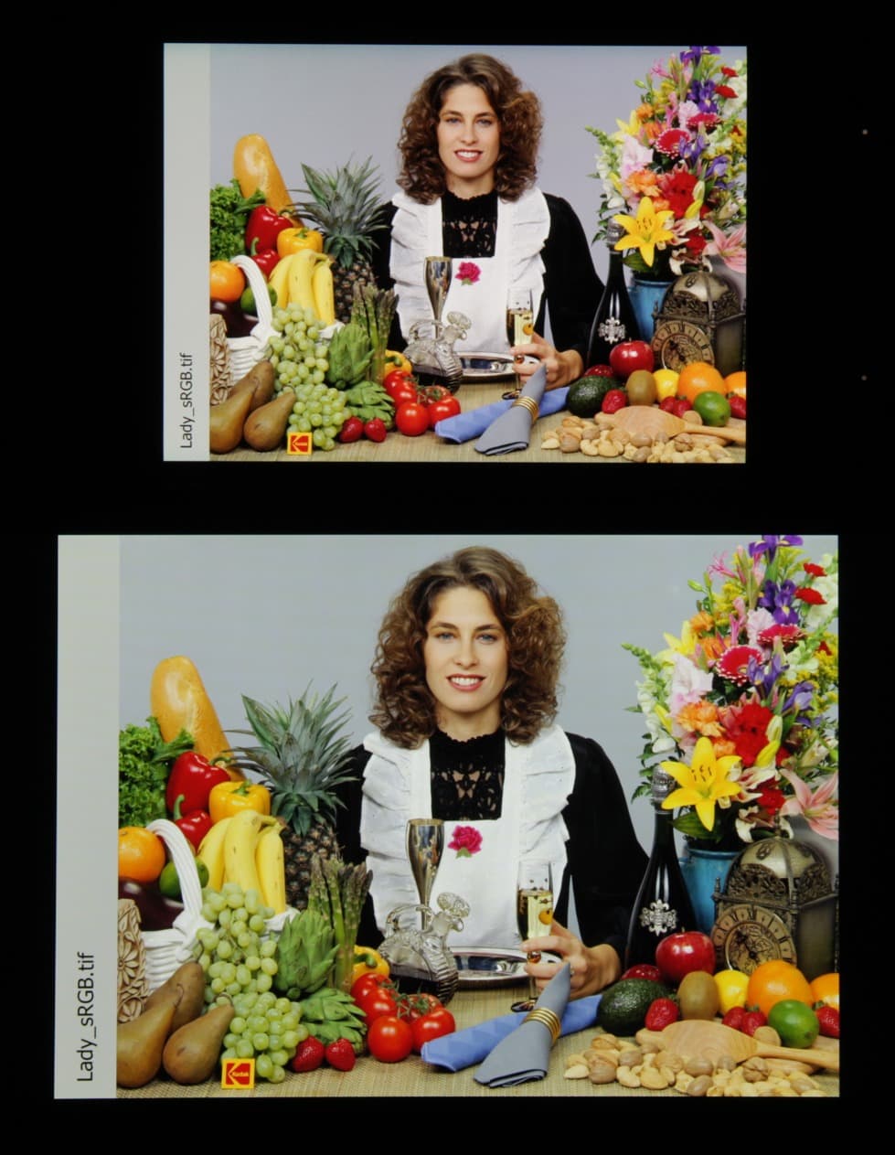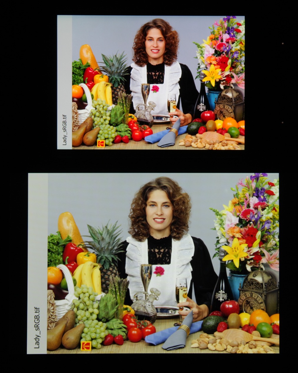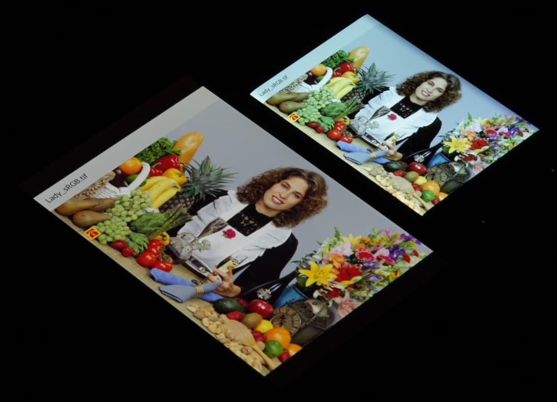 Цвета на экране Xiaomi Mi Note 2 перенасыщены (обратите внимание на помидоры, бананы, салфетку и оттенок лица) и цветовой баланс немного отличается. Заметим, что в данном случае картинка занимает в высоту (при этой ориентации экрана) всю доступную для вывода изображения область и заходит на загнутые края экрана, что приводит к затемнению и искажению цвета. Также на свету эти области почти всегда бликуют, что еще больше мешает при просмотре изображений, выведенных на весь экран. Напомним, что фотография не может служить надежным источником сведений о качестве цветопередачи и приводится только для условной наглядной иллюстрации. Фотография выше получена для профиля Automatic contrast в настройках экрана, всего их три:
