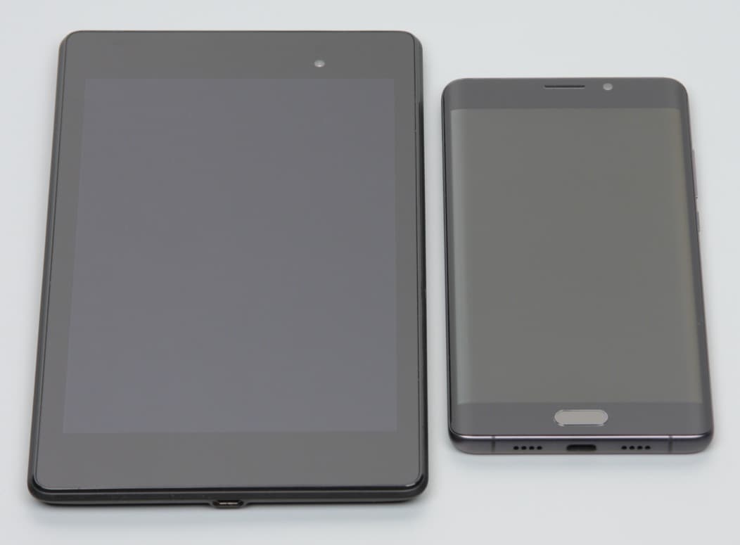 Лицевая поверхность экрана выполнена в виде стеклянной пластины с зеркально-гладкой поверхностью, устойчивой к появлению царапин. Судя по отражению объектов антибликовые свойства экрана лучше, чем у экрана Google Nexus 7 (2013) (далее просто Nexus 7). Для наглядности приведем фотографию, на которой в выключенных экранах отражается белая поверхность (слева — Nexus 7, справа — Xiaomi Mi Note 2, далее их можно различать по размеру):