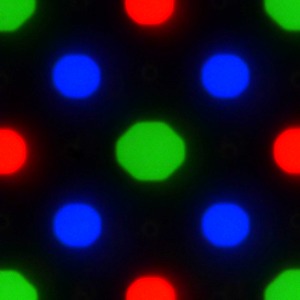 В этом экране используется матрица OLED — матрица на органических светодиодах. Полноцветное изображение создается с помощью субпикселей трех цветов — красного (R), зеленого (G) и синего (B), но зеленых и красных субпикселей в два раза меньше. Это подтверждается фрагментом микрофотографии: