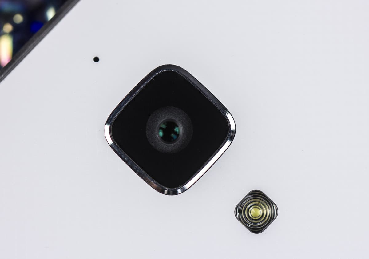 В верхней части крышки находится отверстие дополнительного микрофона, немного выступающий блок основной камеры и светодиод вспышки. Под ними — традиционный логотип производителя из серебристого пластика.