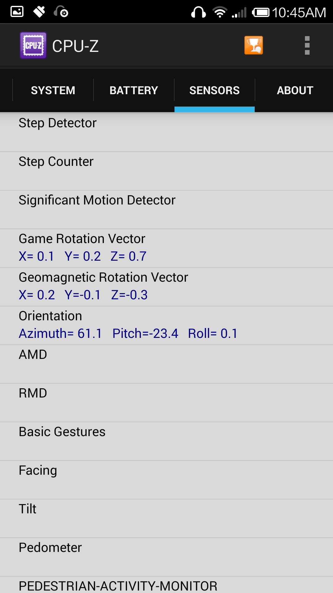 Интересно, что среди списка датчиков в устройстве можно заметить связанные с физической активностью пользователя устройства, в том числе детектор и счетчик шагов.