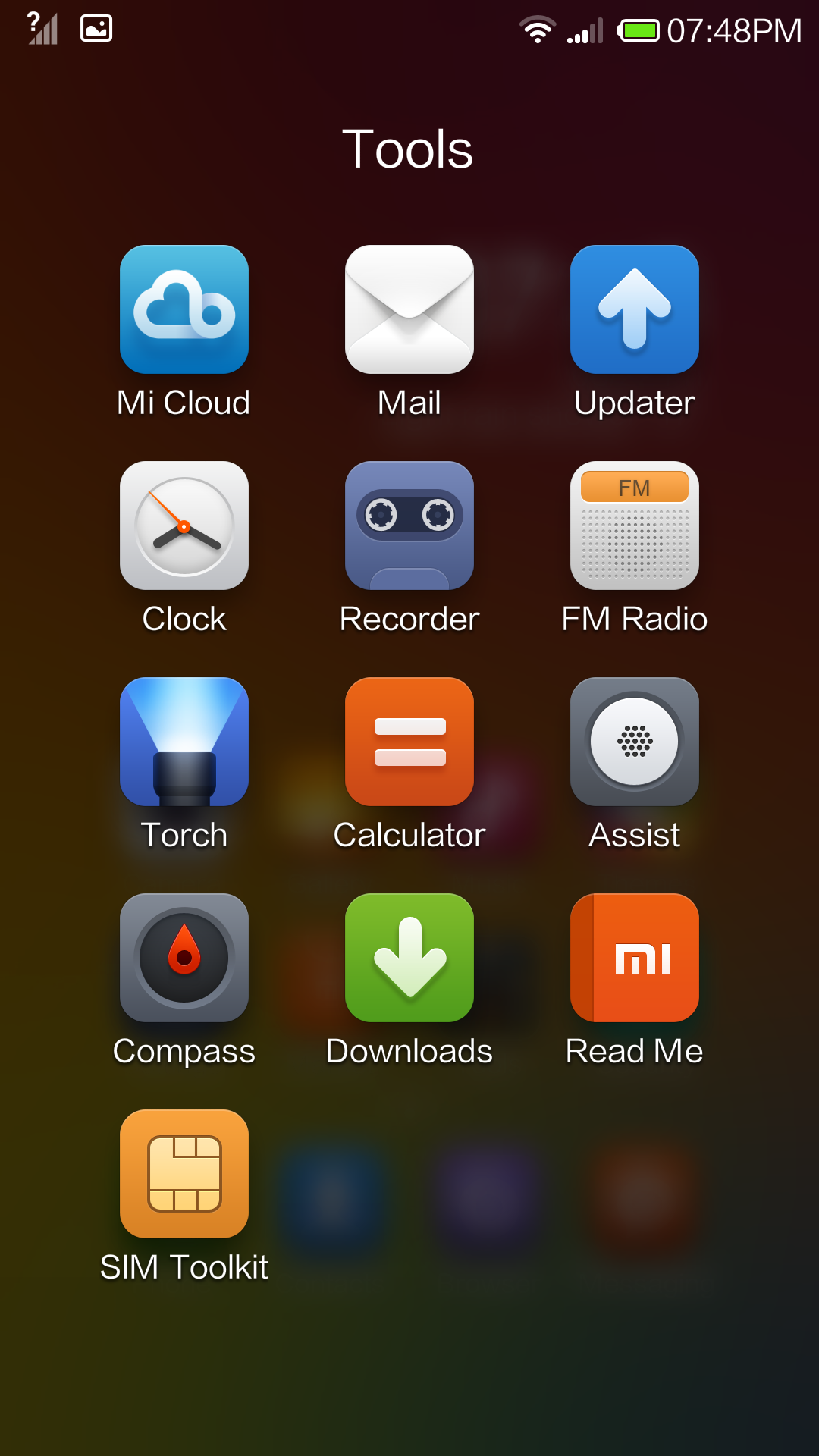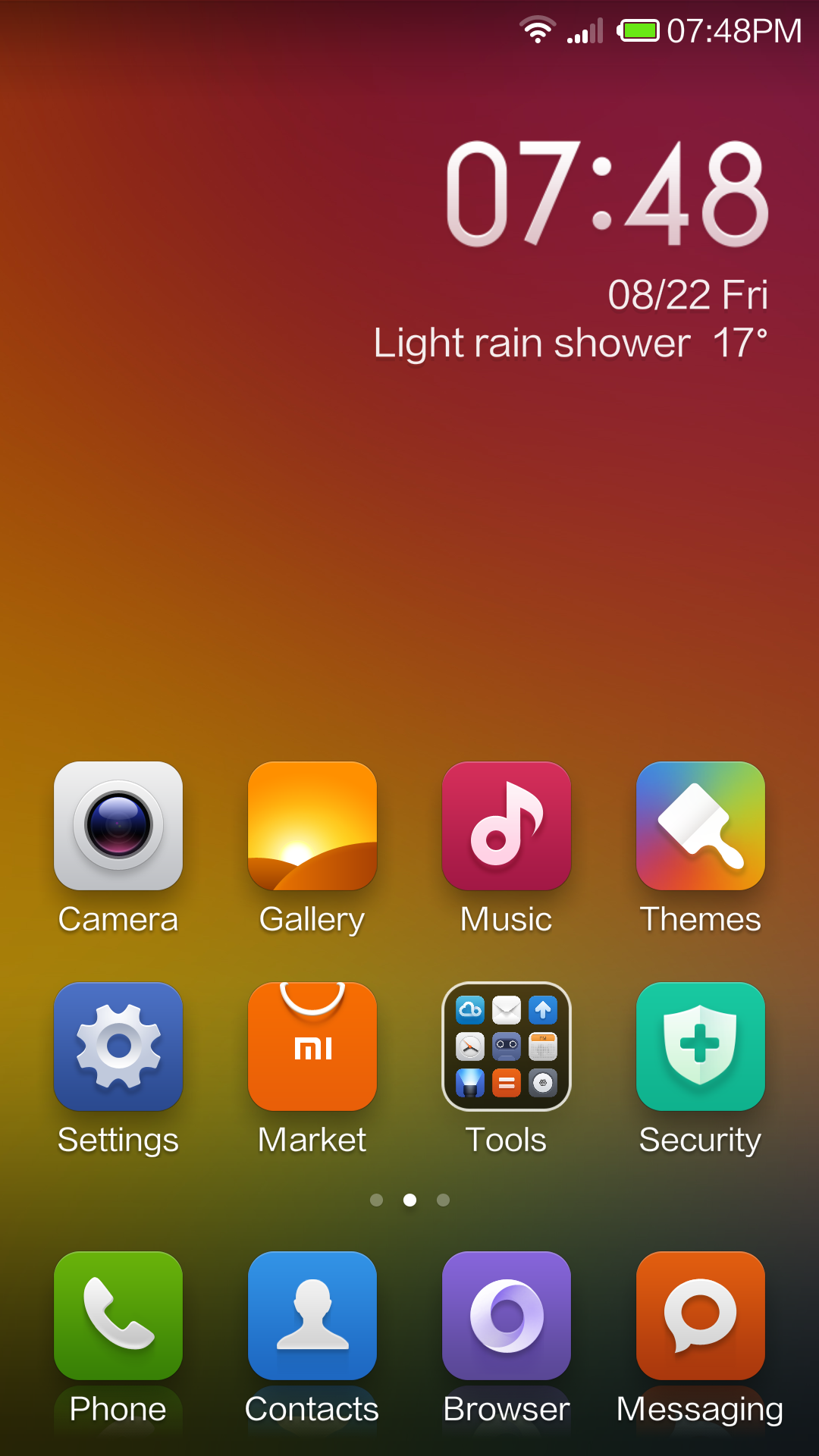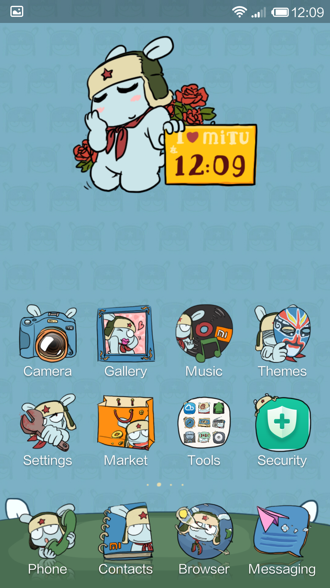 Интерфейс MIUI предполагает размещение иконок всех установленных программ прямо на рабочих столах. Для удобства можно собирать их в группы. На каждом столе можно разместить до 20 значков. В нижней строке присутствуют иконки четырех приложений (телефон, контакты, браузер и сообщения), но можно добавить и пятую. Система предусматривает использование виджетов. В штатной прошивке есть модули переключателей интерфейсов, быстрого перехода к настройкам, часы, фотогалерея, погода, музыка, календарь и другие.
