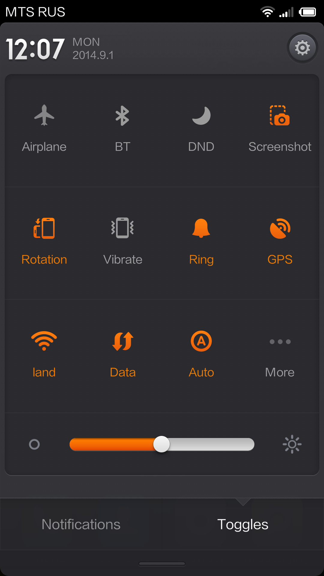 В панель переключателей может уместиться до одиннадцати значков, причем пользователь может самостоятельно менять их состав. Здесь же есть регулятор яркости экрана и кнопка вызова меню настроек. На вкладке уведомлений показывается также некоторая дополнительная информация, например объем загруженных через сотовую сеть данных и органы управления музыкальным плеером. Предусмотрена индивидуальная настройка вариантов уведомлений для каждой программы.
