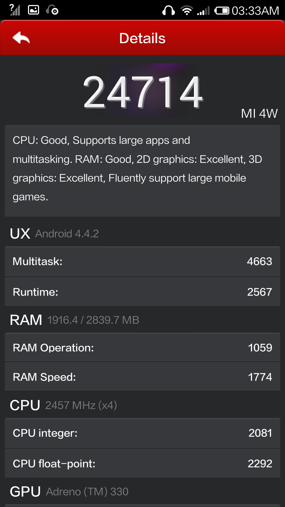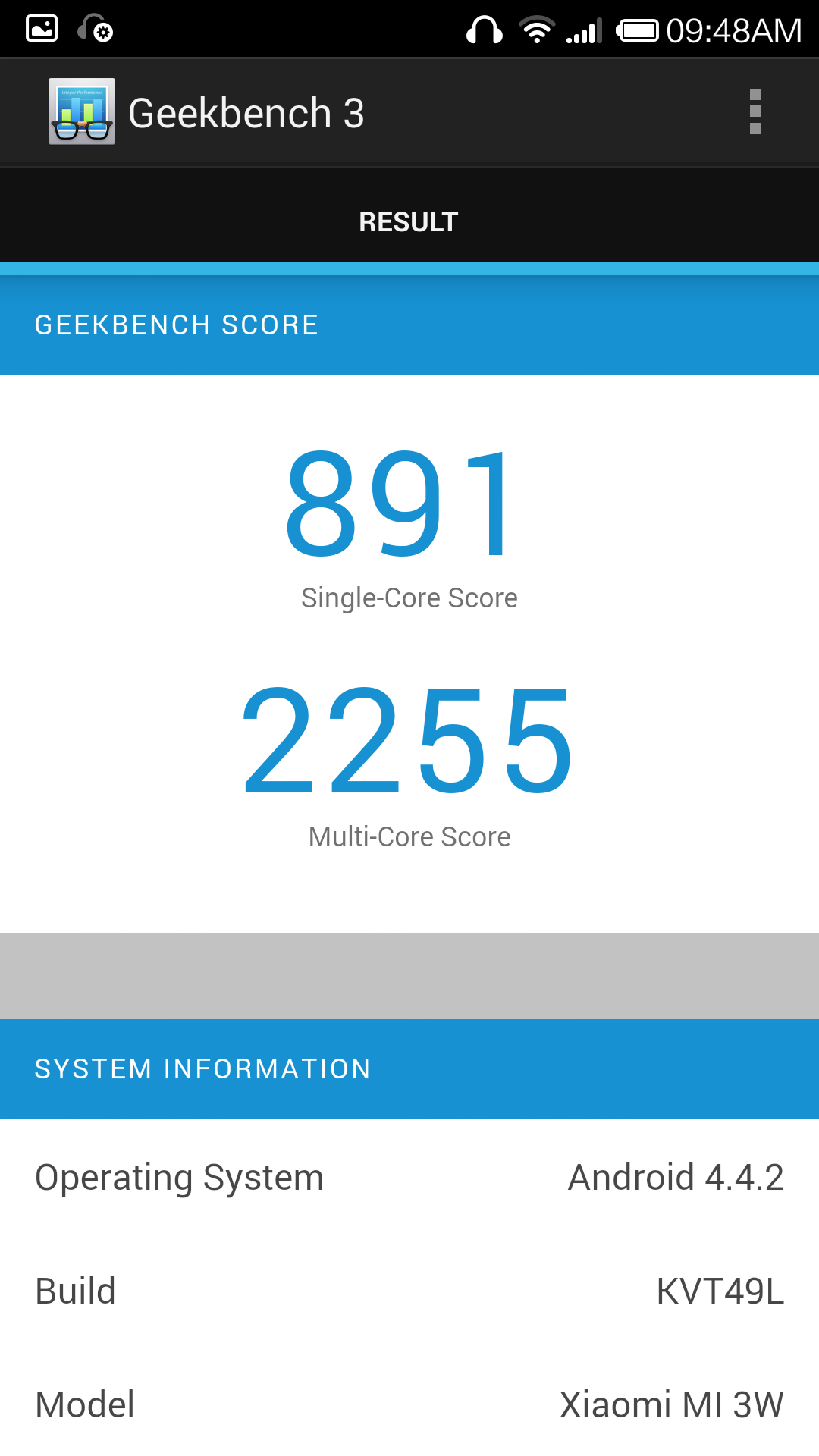 Как и предшественник, Xiaomi Mi4 в версии для сетей WCDMA использует четырехъядерный чип семейства Qualcomm Snapdragon. Только теперь это модификация с частотой ядер 2,5 ГГц (диагностические программы показывают максимальное значение около 2457,6 МГц). На практике в подавляющем большинстве случаев разница не будет заметна. Кроме того, производитель решил добавить еще один гигабайт оперативной памяти — новинка может похвастаться 3 ГБ.