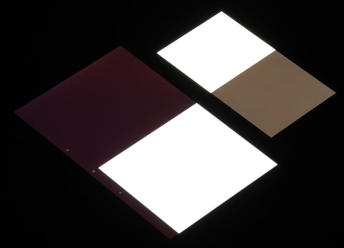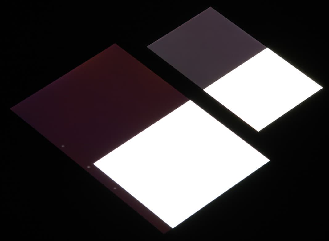 Яркость под углом у экранов уменьшилась (как минимум в 5 раз, исходя из разницы в выдержке), но в случае Xiaomi Mi4 падение яркости заметно больше. Черное поле при отклонении по диагонали высветляется сильно и приобретает фиолетовый или красно-фиолетовый оттенок. Фотографии ниже это демонстрируют (яркость белых участков в перпендикулярном плоскости экранов направлении примерно одинаковая!):