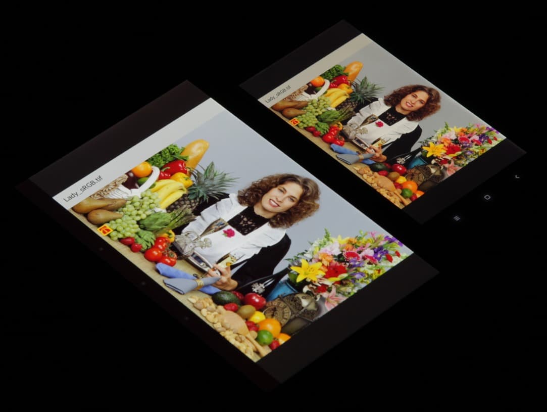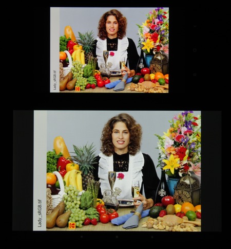 Они нетипичные, но их мы уже видели в случае Sony Xperia Z2 и Sony Xperia Z2 Tablet. Sony указывает, что в этих экранах используются светодиоды с синим излучателем и зеленым и красным люминофором (обычно — синий излучатель и желтый люминофор), что в сочетании со специальными светофильтрами матрицы и позволяет получить широкий цветовой охват. Скорее всего, данное утверждение верно и в случае Xiaomi Mi4. В характеристиках этого смартфона просто пишут, что охват очень широкий и составляет 84% от охвата NTSC, преподнося данный факт как неоспоримое достоинство. Это является откровенной ложью, так как в итоге цвета изображений — рисунков, фотографий и фильмов, — ориентированных на пространство sRGB (а таких подавляющее большинство), имеют неестественную насыщенность. Особенно это заметно на узнаваемых оттенках, например на оттенках кожи. Результат приведен на фотографии выше. Но обыватель привык, что если что-то больше, то оно лучше, поэтому подобный обман производителю обычно удается и сходит с рук.