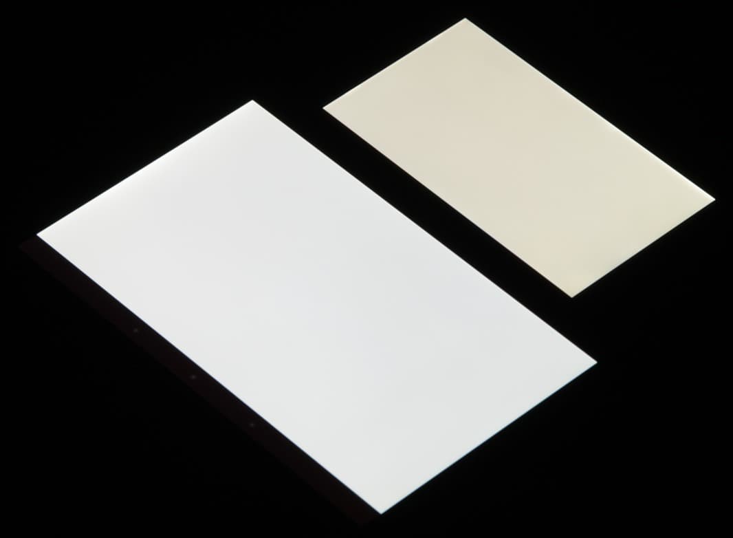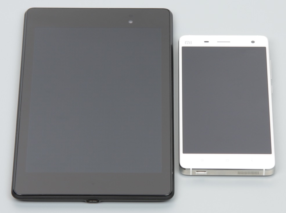 Лицевая поверхность экрана выполнена в виде стеклянной пластины с зеркально-гладкой поверхностью, устойчивой к появлению царапин. Судя по отражению объектов антибликовые свойства экрана не хуже, чем у экрана Google Nexus 7 (2013) (далее просто Nexus 7). Для наглядности приведем фотографию, на которой в выключенных экранах отражается белая поверхность (слева — Nexus 7, справа — Xiaomi Mi4, далее их можно различать по размеру):
