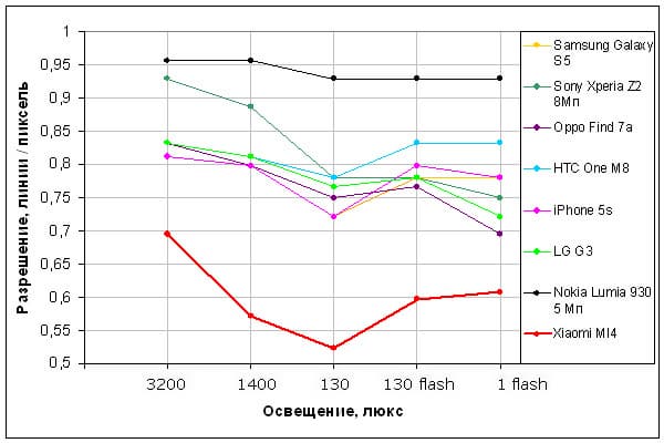 Лишний раз проблемы камеры подтверждаются стендовой съемкой. По графику видно, что камера демонстрирует плохой результат, и лишь при хорошем освещении результат еще можно назвать приемлемым, да и то, как видно по полевым снимкам, не всегда.