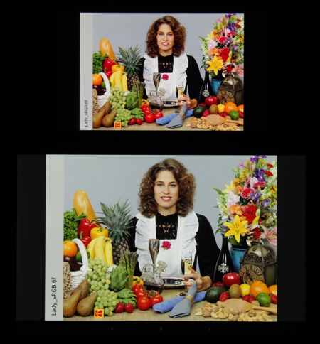 Баланс оттенков на шкале серого хороший, так как цветовая температура несильно выше стандартных 6500 К, и отклонение от спектра абсолютно черного тела (ΔE) меньше 10, что для потребительского устройства считается хорошим показателем. При этом цветовая температура и ΔE (без учета резкого снижения в темной области) мало изменяются от оттенка к оттенку — это положительно сказывается на визуальной оценке цветового баланса. (Самые темные области шкалы серого можно не учитывать, так как там баланс цветов не имеет большого значения, да и погрешность измерений цветовых характеристик на низкой яркости большая.)