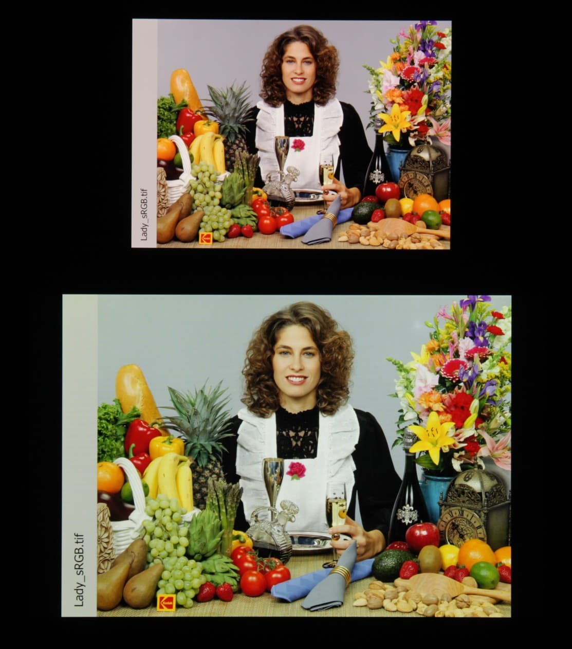 Отметим, что на экранах с широким цветовым охватом без соответствующей коррекции цвета обычных изображений, оптимизированных для устройств sRGB, выглядят неестественно насыщенными. Отсюда и рекомендация: в большинстве случаев смотреть кино, фотографии и все естественное лучше при выборе профиля Стандарт. Профиль Яркий уместен при просмотре материала с охватом DCI-P3, принятым в цифровом кинематографе, но в быту встречающимся редко.