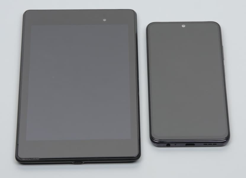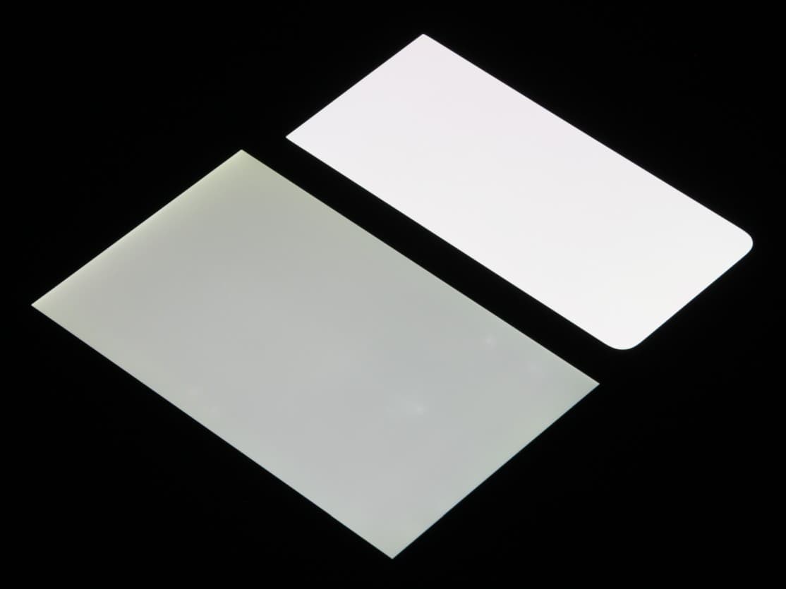 Лицевая поверхность экрана выполнена в виде стеклянной пластины с зеркально-гладкой поверхностью, устойчивой к появлению царапин. Судя по отражению объектов, антибликовые свойства экрана лучше, чем у экрана Google Nexus 7 (2013) (далее просто Nexus 7). Для наглядности приведем фотографию, на которой в выключенных экранах отражается белая поверхность (слева — Nexus 7, справа — Xiaomi Redmi Note 10S, далее их можно различать по размеру):