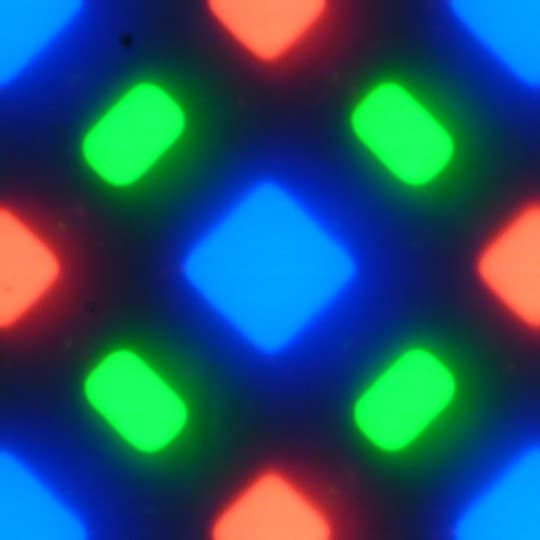 В этом экране используется матрица Super AMOLED — активная матрица на органических светодиодах. Полноцветное изображение создается с помощью субпикселей трех цветов — красного (R), зеленого (G) и синего (B), но красных и синих субпикселей в два раза меньше, что можно обозначить как RGBG. Это подтверждается фрагментом микрофотографии: