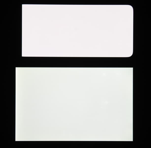 Экран характеризуется великолепными углами обзора. Правда, белый цвет при отклонении даже на небольшие углы приобретает легкий сине-зеленый или розоватый оттенок, но черный цвет остается просто черным под любыми углами. Он настолько черный, что параметр контрастности в данном случае неприменим. Для сравнения приведем фотографии, на которых на экраны Xiaomi Redmi Note 10S и Nexus 7 выведены одинаковые изображения, при этом яркость экранов изначально установлена примерно на 200 кд/м², а цветовой баланс на фотоаппарате принудительно переключен на 6500 К.