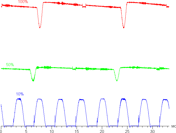 На любом уровне яркости присутствует значимая модуляция с частотой 60 или 240 Гц. На рисунке ниже приведены зависимости яркости (вертикальная ось) от времени (горизонтальная ось) для нескольких значений настройки яркости: