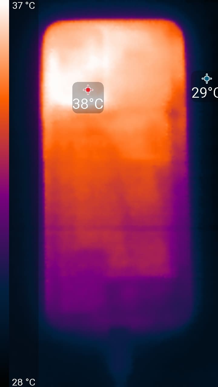 Нагрев больше в верхней части аппарата, что, видимо, соответствует расположению микросхемы SoC. По данным теплокамеры, максимальный нагрев составил 38 градусов (при температуре окружающего воздуха в 24 градуса), это не очень много.