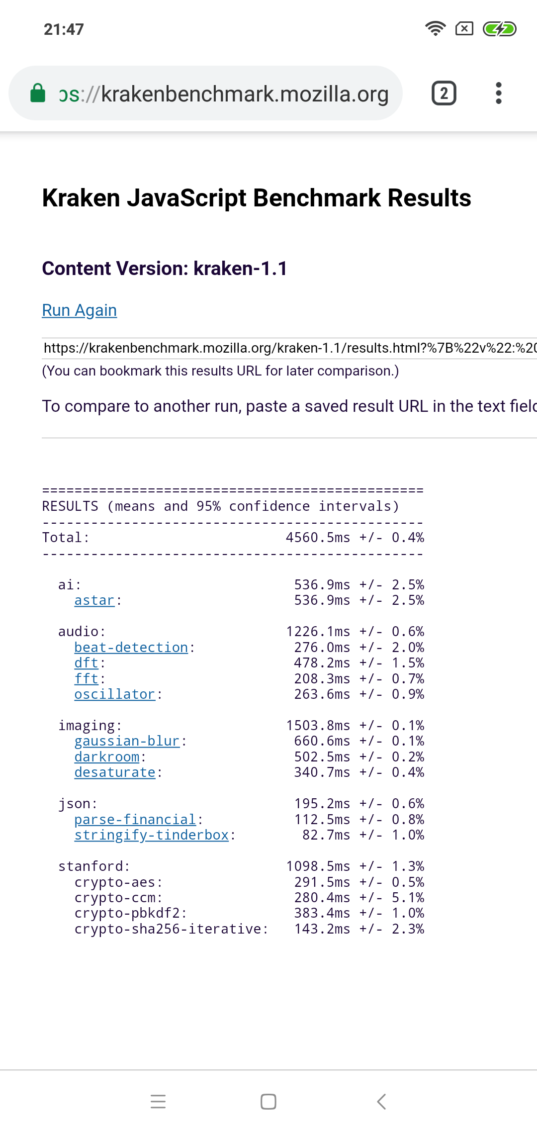 | Mozilla Kraken (мс, меньше — лучше) | 4561 | 4157 | 3804 | 4126 | 4487 |